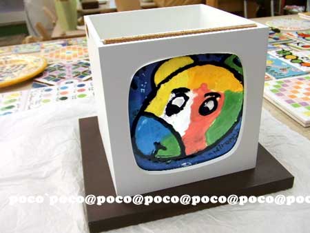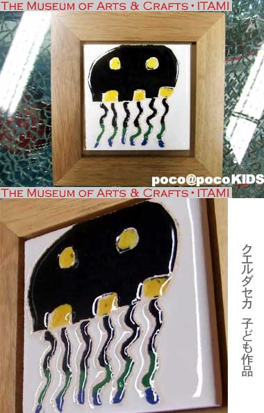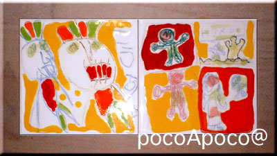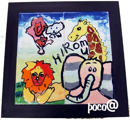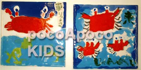 伊丹市立工芸センターmuseum of art and craft Tel 072-772-5557 スペインタイル教室 美術館講座でワークショップ >>>41名のプチ/マエストラ!^o^ご参加ありがとうございました。焼き上がりました。こちらよりご覧頂けます。 こちらは、子どもさんの描いた絵にpocoApoco工房での仕上げ例です。 クエルダセカ(ぷくぷく強め)仕上げ=上のイカのような一点デザインの場合、150mmX150mmタイル: 12,600円、90mmX90mmタイル10,500円、デザイン料5,250円/1種類のデザインが加算されます。(2009,8月までデザイン料は3割り引き=3670円で承ります。)カニ絵のような細かいデザインの場合は、150mmX150mmタイル14700円。 一番上のタイルはプクプクせずに、クレヨンの質感をだしています。クレヨンタイルも同価格から。お問い合わせ下さい。 >>volver a pocoApoco